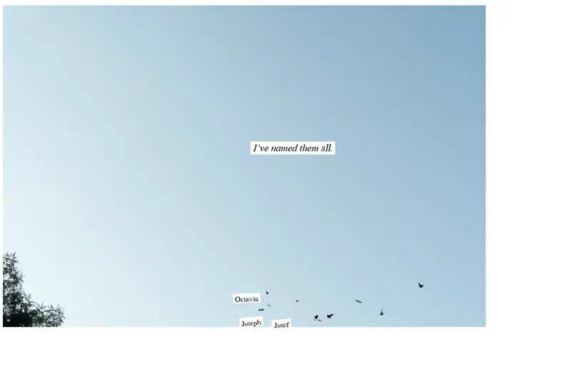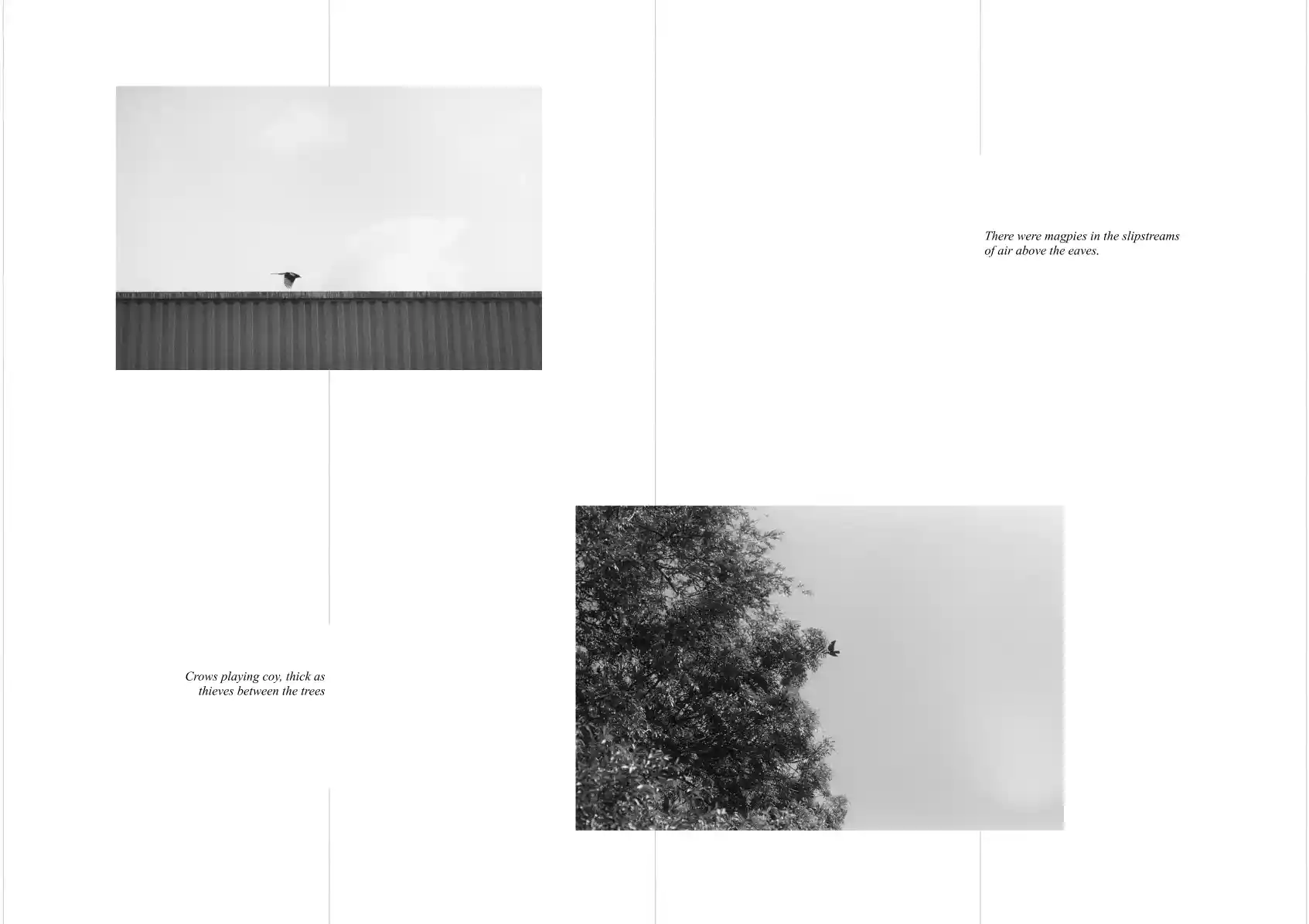 A photobook is a good medium in part because it’s rigid. One of the mechanisms of storytelling is the setting and breaking of expectations, and it’s very easy to set expectations in a book. In this book, most pages have an image and some text. When pigeons overflow the expected bounds of an image, it’s a very obvious change. It’s easy to convey a departure from the status quo when the status quo is limited and uncomplicated.