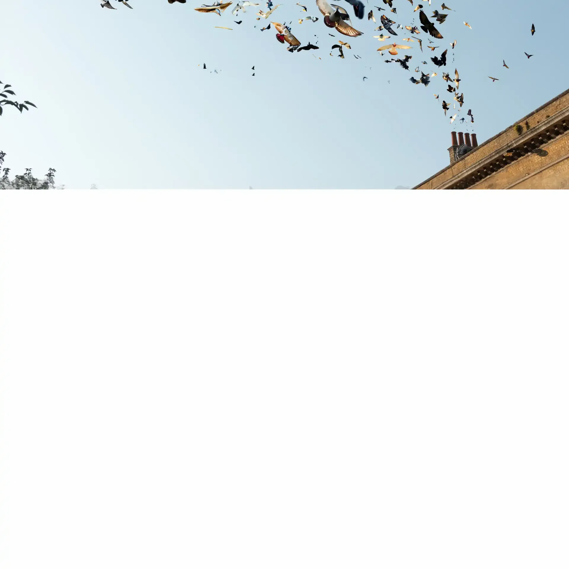 a little troupe of faraway flying pigeons, no more than specks against the clear sky